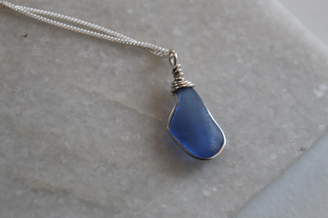 Seaglass necklace wrapped in recycled ECO sterling silver and hung on a 16 inch sterling silver chain.